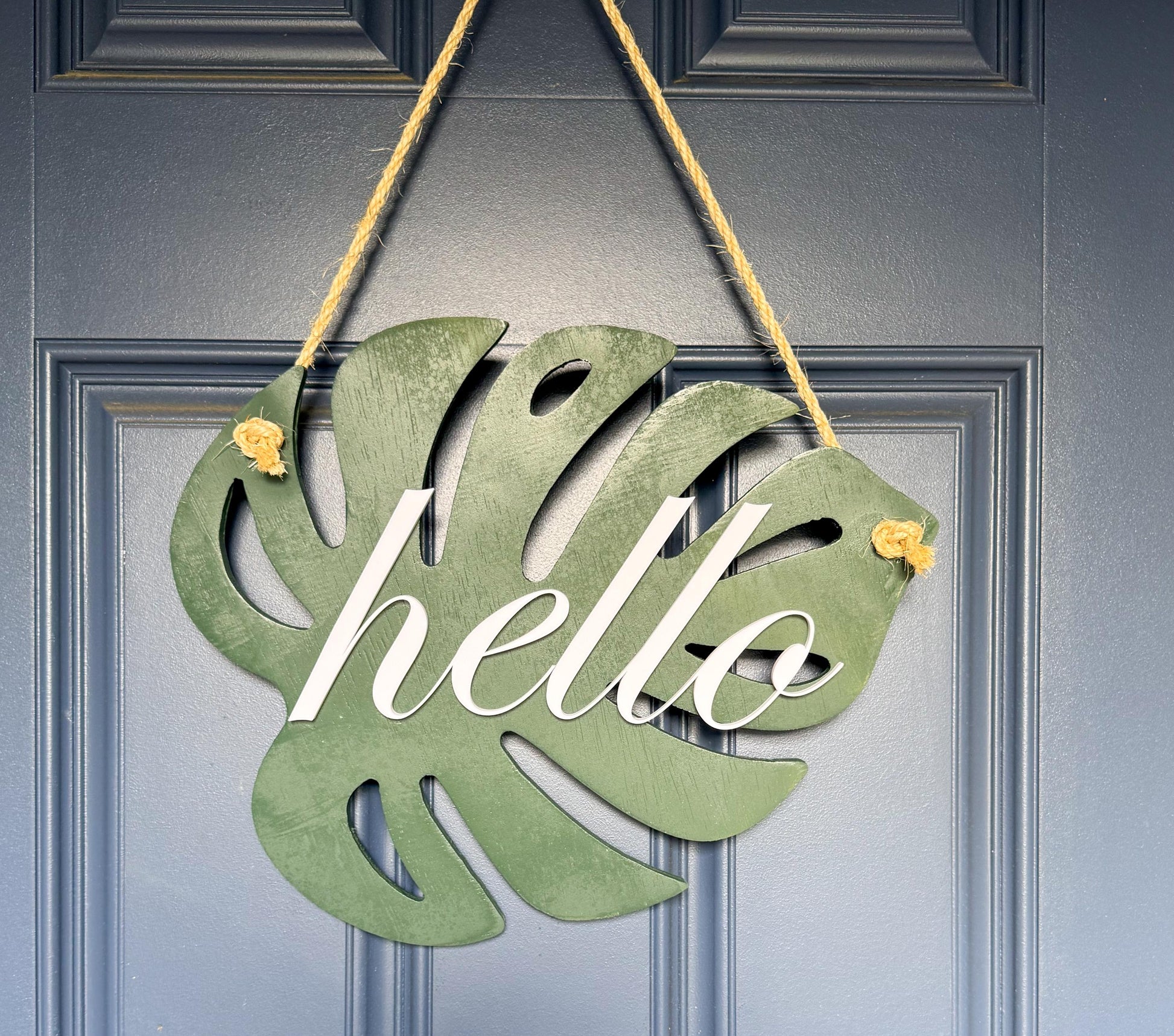 Welcome your guests with a tropical twist! This handcrafted Monstera Leaf Door Hanger brings island-inspired charm right to your doorstep. Shaped like the iconic monstera leaf and featuring a 3D printed “Hello” in elegant script, this piece adds a warm and inviting touch to your front door, entryway, or covered patio.